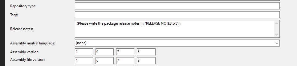 4. Add a comment in the Assembly Release Notes field, to point other developers to use the Release Notes.txt file.