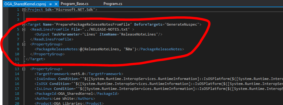 5. Now, we need to create a MSBuild Target (like the below screenshot) in the csproj file so that MSBuild can pick up the release notes before the nuget package is built.