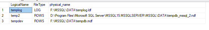 ALTER DATABASE tempdb MODIFY FILE ( NAME = temp2, FILENAME = N'F:\MSSQL\DATA\tempdb_mssql_2.ndf' );