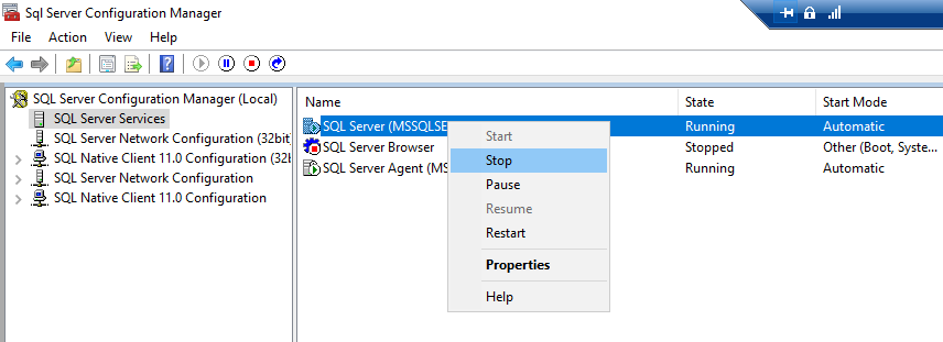 Open the SQL Server Configuration Manager, and stop the SQL Server engine.